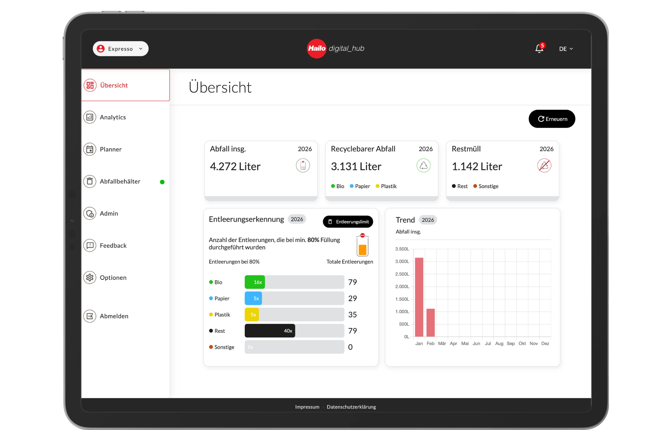 Füllstände und Entleerungen werden nachvollziehbar. Sie sehen, wo Aufwand entsteht und können Prozesse gezielt steuern. Gleichzeitig schaffen Sie eine belastbare Datengrundlage für Reporting und ESG-Anforderungen.