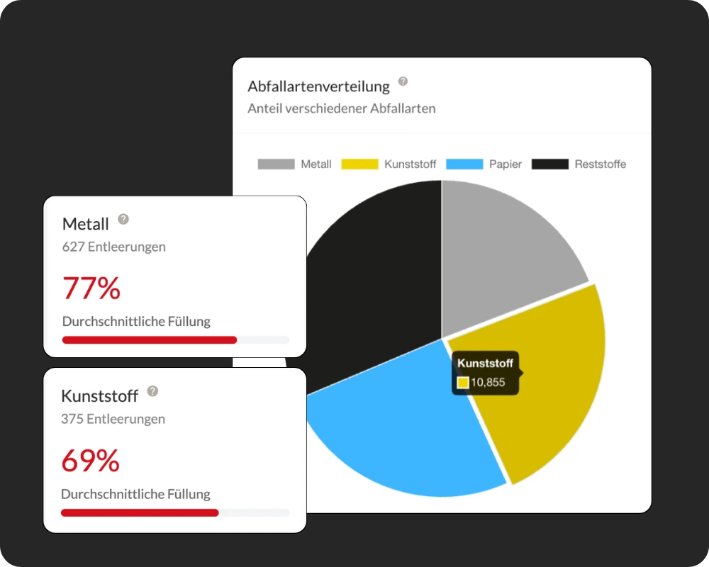 Füllstände und Entleerungen werden nachvollziehbar. Sie sehen, wo Aufwand entsteht und können Prozesse gezielt steuern. So schaffen Sie eine belastbare Datengrundlage für Prozesssteuerung und ESG-Anforderungen.